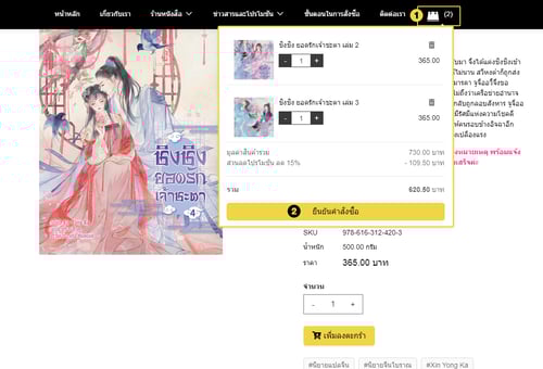 2. เข้าไปที่ ร้านหนังสือ เลือกหนังสือที่สนใจ กดปุ่ม เพิ่มลงตะกร้า เพื่อซื้อสินค้า หนังสือที่เลือกจะเข้าไปอยู่ในตะกร้าสินค้าที่แถบเมนูด้านบน สามารถตรวจสอบหรือแก้ไขรายการสั่งซื้อได้ที่นี่ค่ะ เมื่อเลือกซื้อหนังสือครบตามที่ต้องการแล้ว ให้กดเข้าไปที่ ตะกร้าสินค้า ตรวจสอบรายการสั่งซื้อ แล้วจึงกด 'ยืนยันการสั่งซื้อ' เพื่อดำเนินการขั้นตอนต่อไป