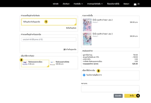 3.หลังกดยืนยันการสั่งซื้อแล้ว ให้เลือกที่อยู่ในการจัดส่งส่ง วิธีการจัดส่ง และวิธีการชำระเงิน ก่อนกดสั่งซื้อ